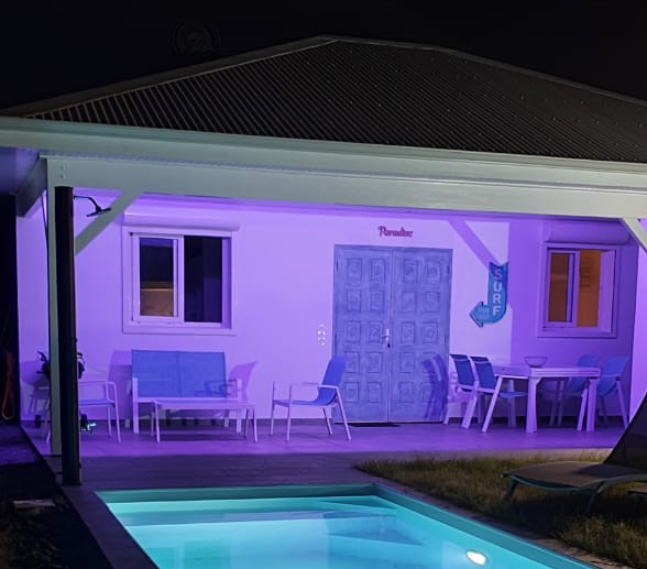Le salon extérieur face à la piscine vous permettra de vous détendre ou de savourer votre ti punch, et vous pourrez vous prélasser sur les chaises longues au bord de la piscine ( 4 x 2,5m) avec douche extérieure et alarme.