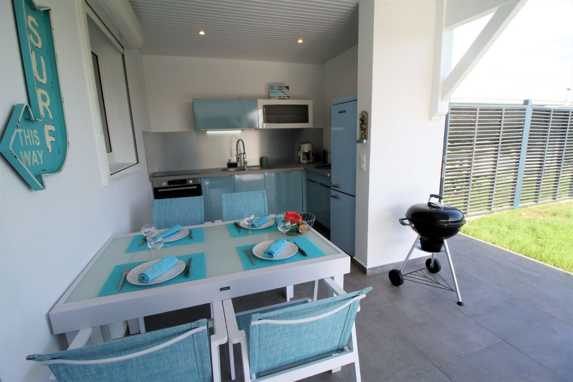 Terrasse couverte de 30 m² qui abrite une cuisine entièrement équipée (four, plaque à induction, frigo/congélateur, lave vaisselle, micro onde, cafetière classique, cafetière Nespresso, grille pain, bouilloire…),